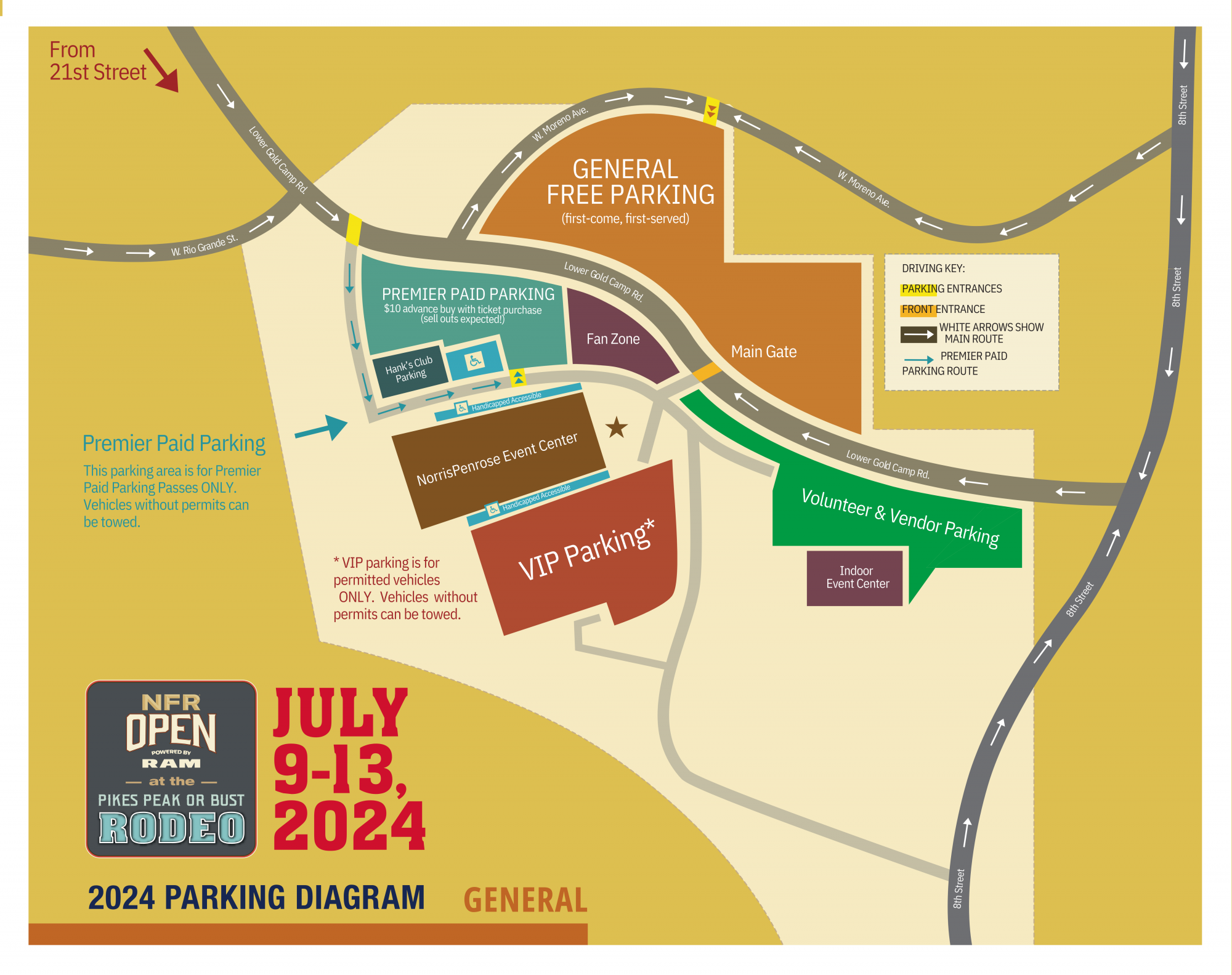 Introducing a new feature for this year: Premier Paid Parking, priced at $10 per spot, must be bought along with your tickets. Due to limited availability, this option is expected to fill up fast. General parking is also offered on a first-come, first-served basis. Additionally, there's convenient free offsite parking with a shuttle service to and from the Rodeo.